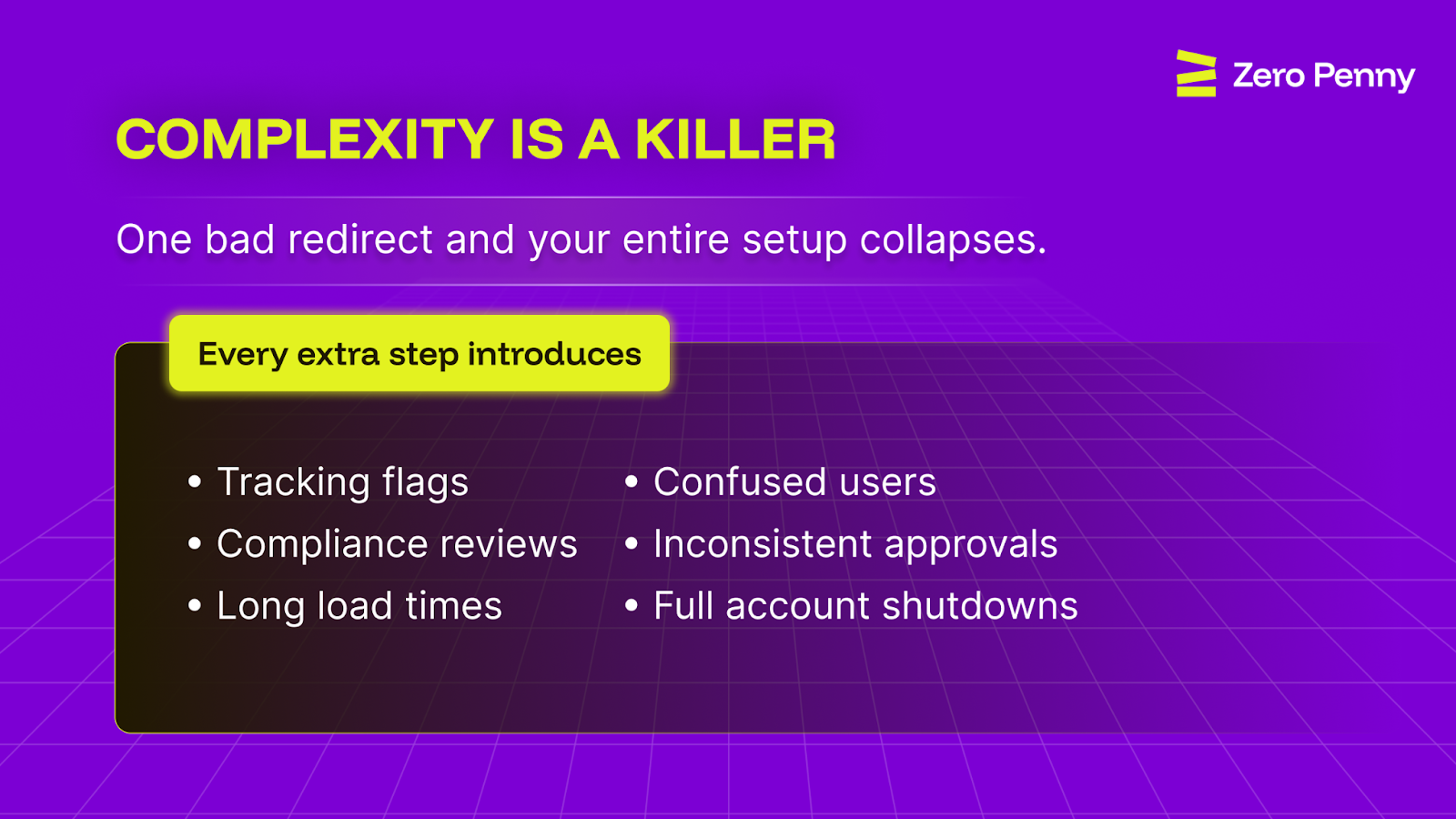 Every additional element in your funnel creates a new failure point. Every redirect raises a red flag. Every "smart" automation looks suspicious to platform algorithms.
